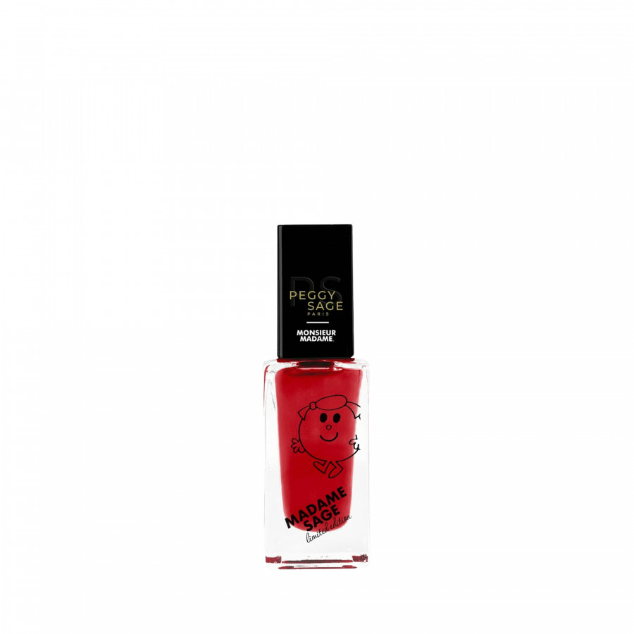 | Le + produit | Le vernis à ongles Madame Sage de la collection Monsieur Madame par Peggy Sage illumine les mains d'un rouge élégant et intemporel. Grâce à son séchage rapide à l'air libre, sa tenue optimale et sa brillance intense, il s'accorde parfaitement au vernis enfant Madame Bavarde pour une manucure complice. |