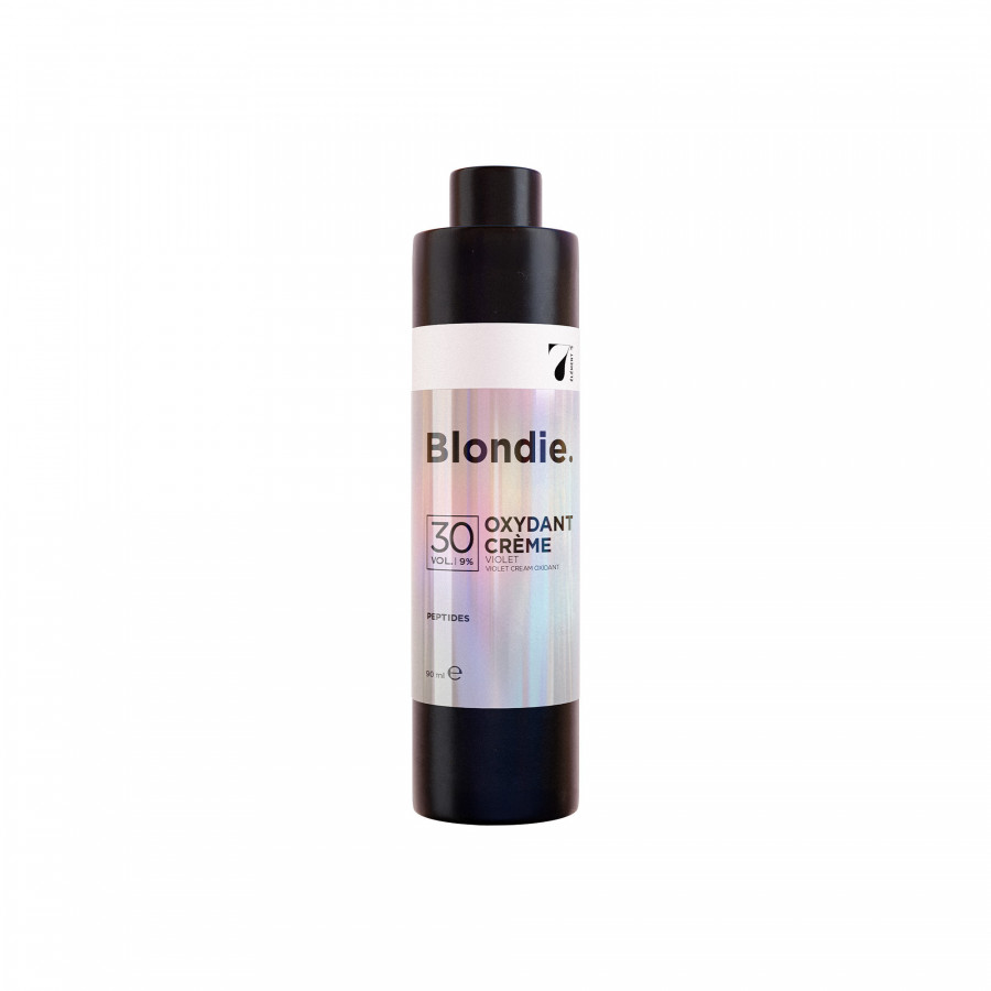 | Le + produit | L'oxydant crème Blondie. 30 volumes - 90 ml de 7ème Élément est formulé pour offrir un pouvoir éclaircissant intense tout en protégeant la fibre capillaire grâce aux peptides biomimétiques et aux pigments violets neutralisants. Idéal pour les services à haute exigence technique. |