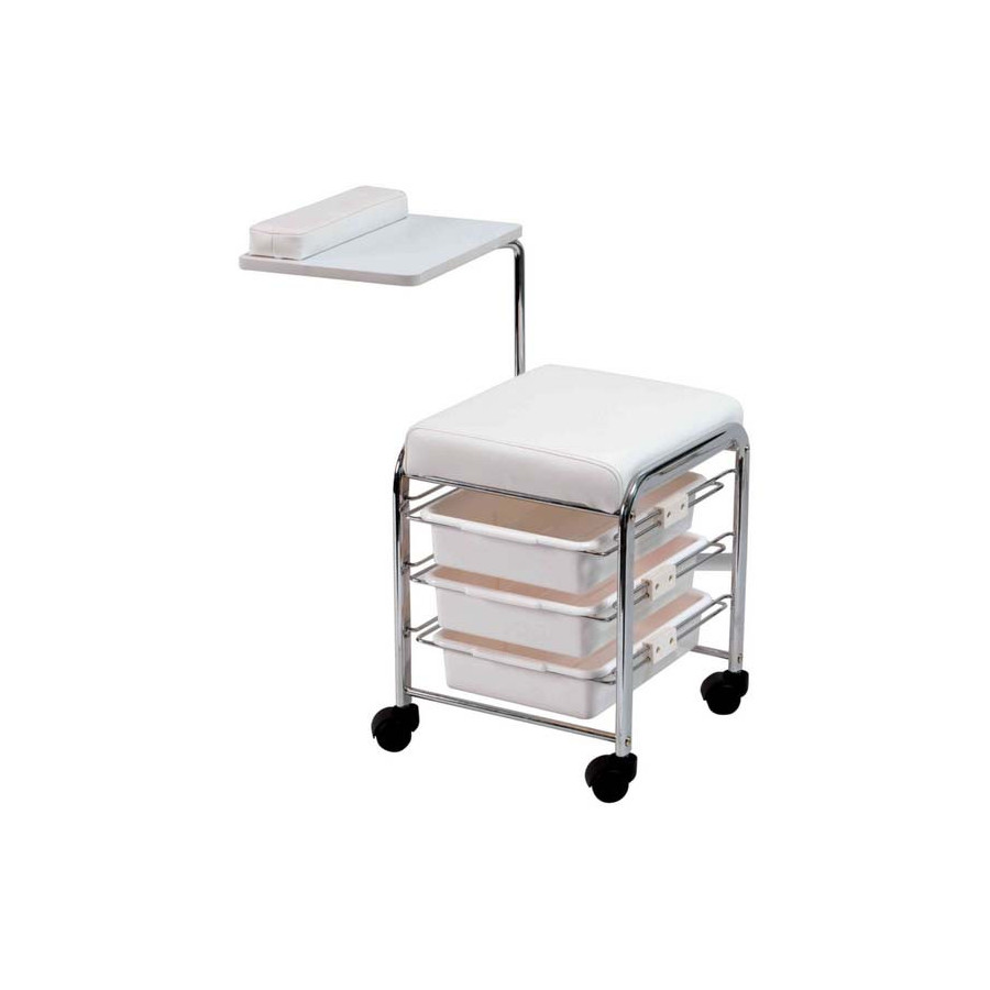Tabouret professionnel pour la manucure, avec une structure solide contenant 3 tiroirs de rangement et une session en faux cuir + 1 bras avec plateau pour les objets. Il équipé de roues pratiques qui permettent un déplacement facile.