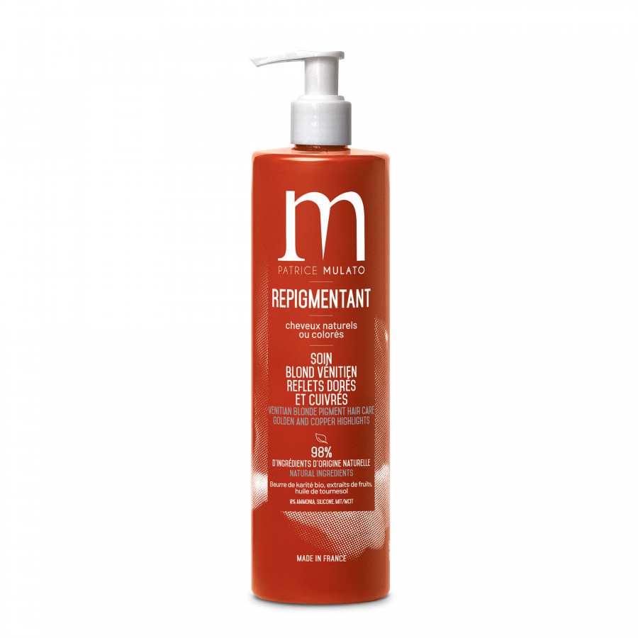 Le soin repigmentant Blond vénitien apporte des reflets dorés-cuivrés aux cheveux colorés ou naturels.