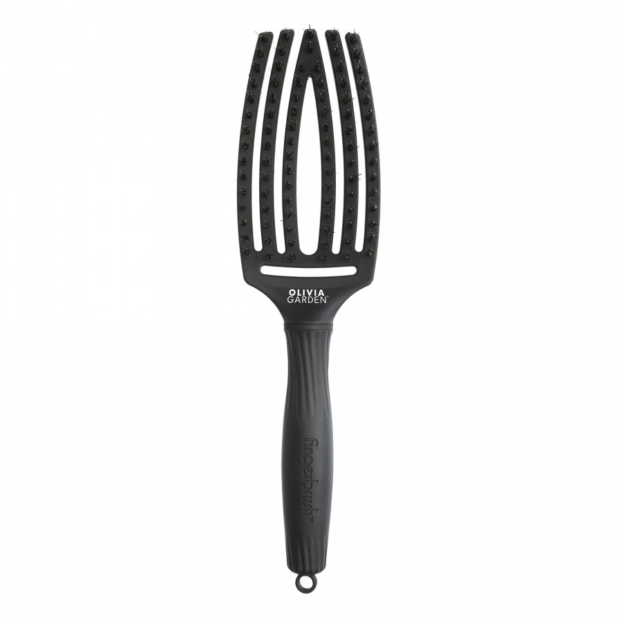 La Fingerbrush Iconic Boar & Nylon Full Black de Olivia Garden est une brosse innovante conçue pour démêler facilement et sans douleur tout en prenant soin des cheveux et du cuir chevelu. Grâce à la combinaison de poils de sanglier et de picots en nylon, elle offre une distribution uniforme des huiles naturelles, ce qui améliore la brillance des cheveux tout en réduisant les frisottis.