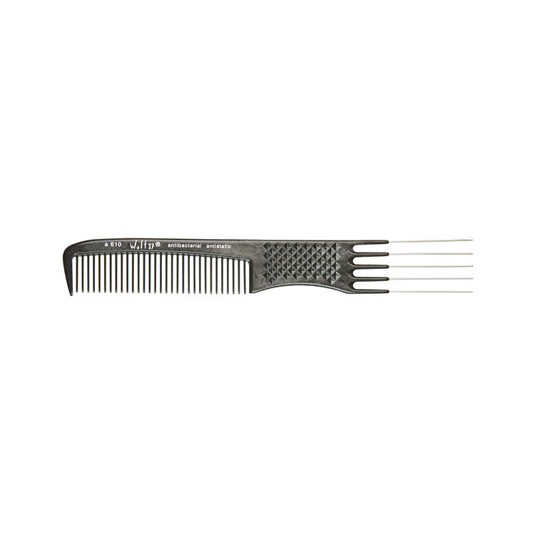 | Conseil d'utilisation | 1) Pour crêper, utiliser les dents en se faisant des mouvements du milieu de la mèche vers la racine2) Pour coiffer mises en plis, permanente, ou crêpage, passer la fourchette dans la chevelure sans trop appuyer pour rester en surface de la chevelure afin de ne casser ni le mouvement des boucles (permanente) ni le volume (crêpage, mise en plis). |